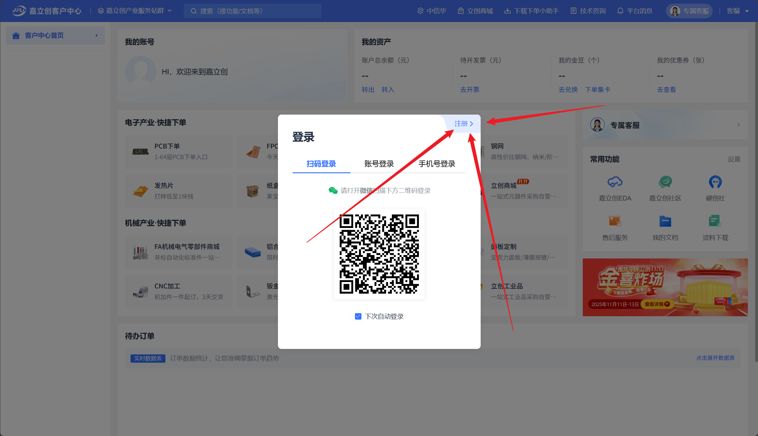 访问 嘉立创下单平台 并注册一个免费账号。