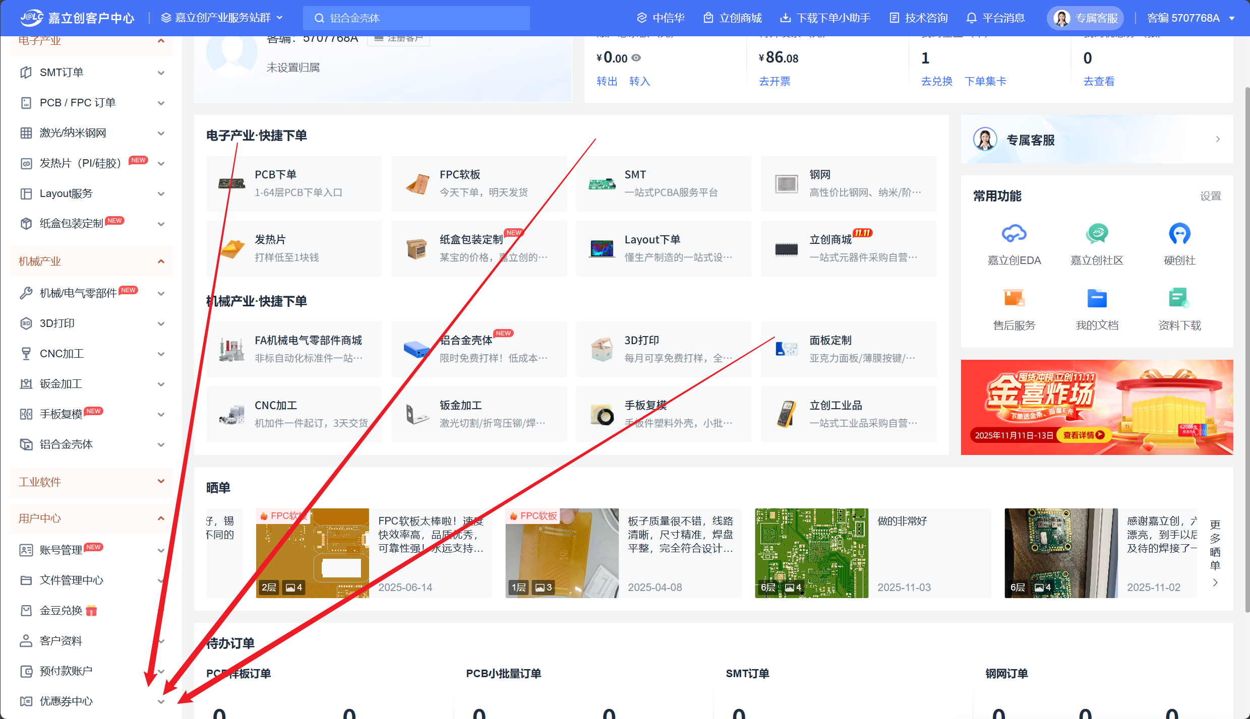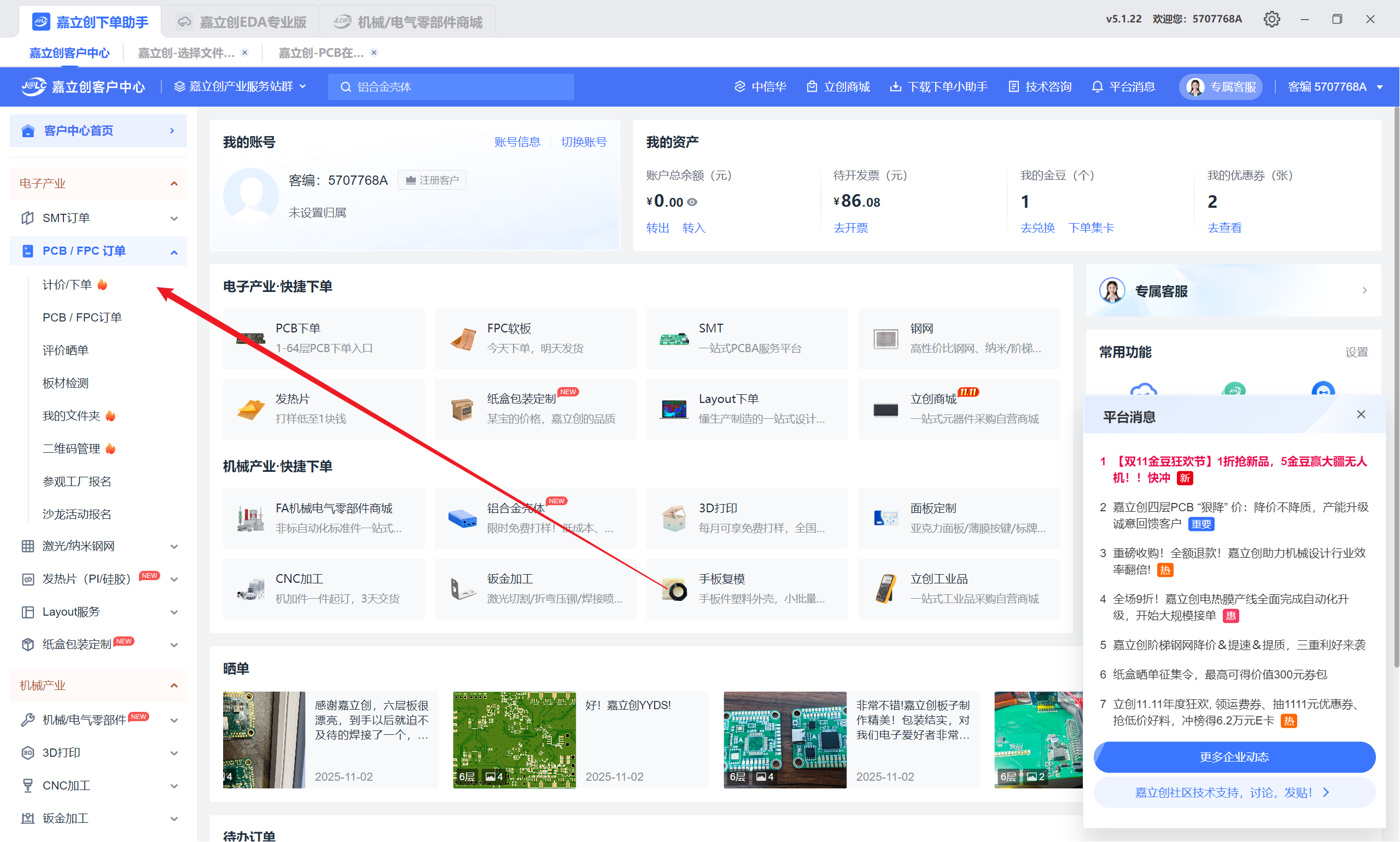 登录嘉立创下单平台官网,通过手机号注册新账号。请确保使用中国大陆手机号注册,以便接收验证码。注册完成后,登录系统并检查账户状态是否正常。