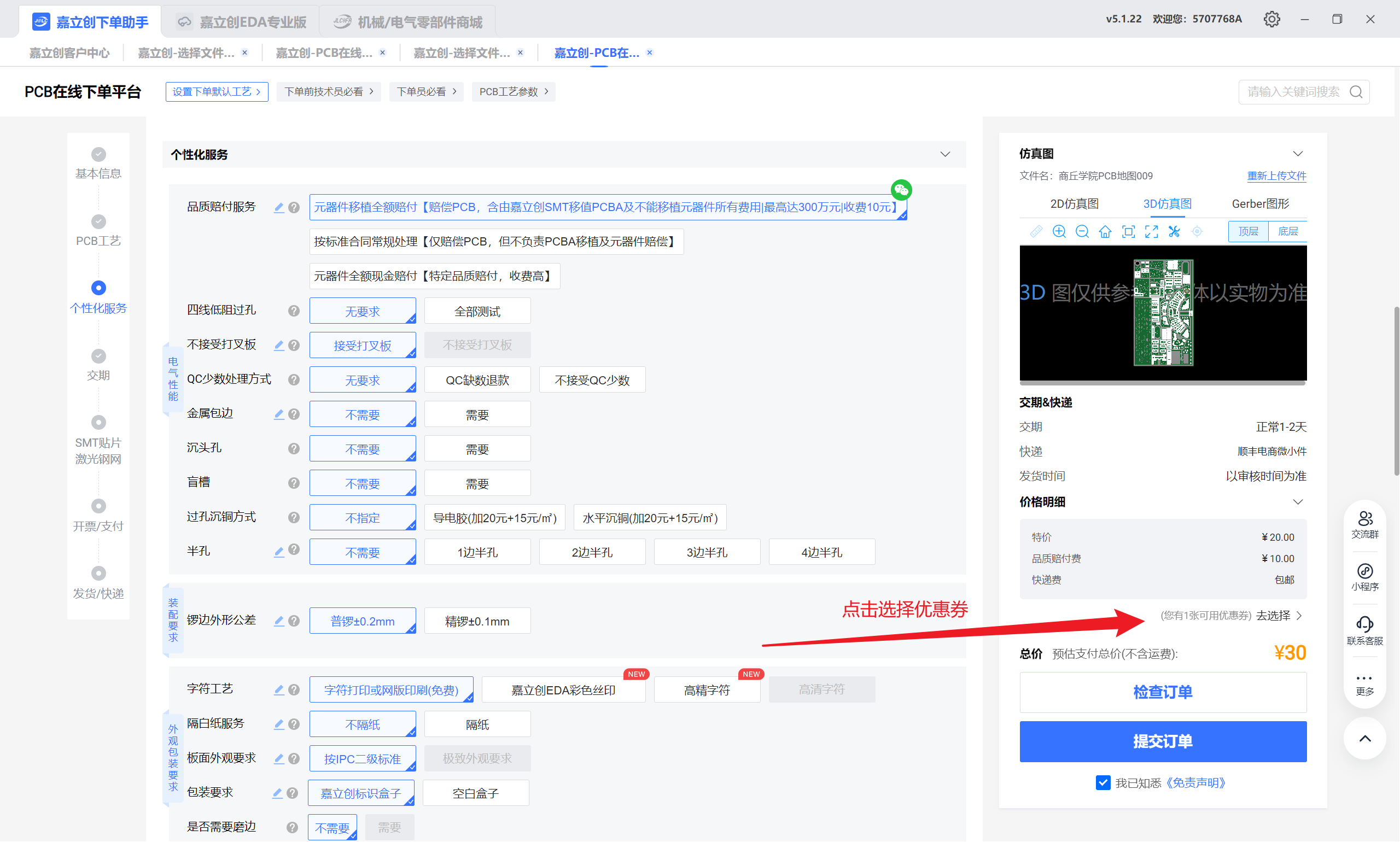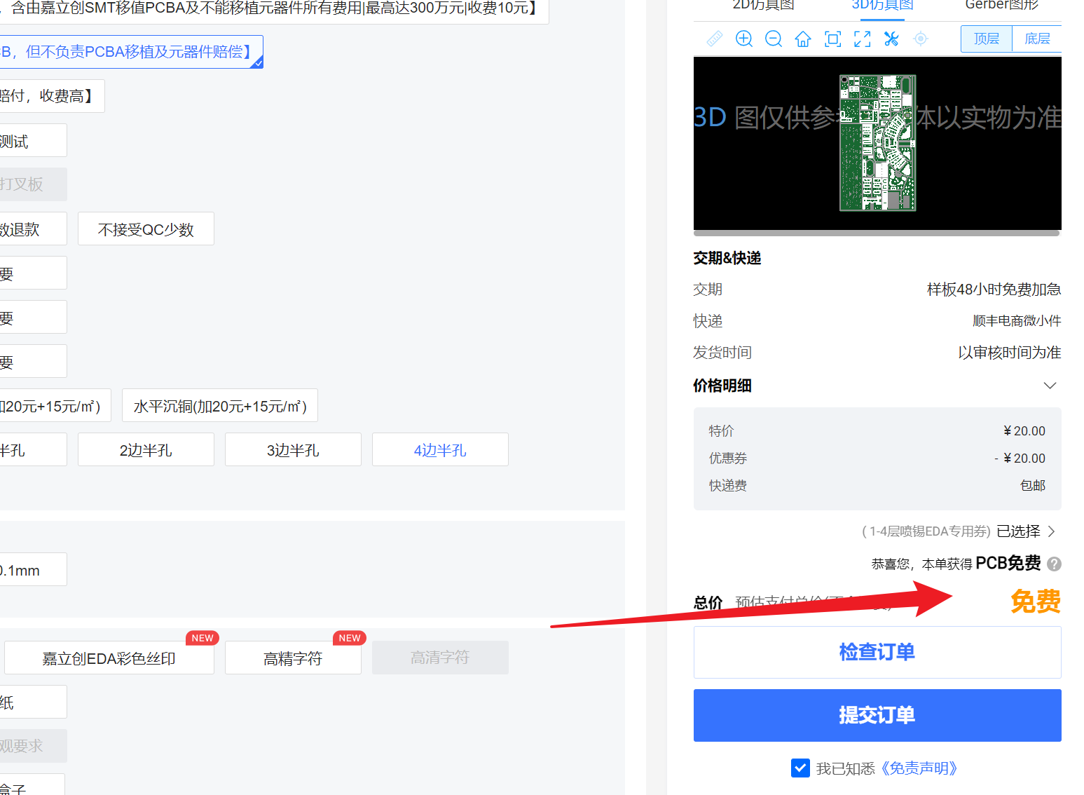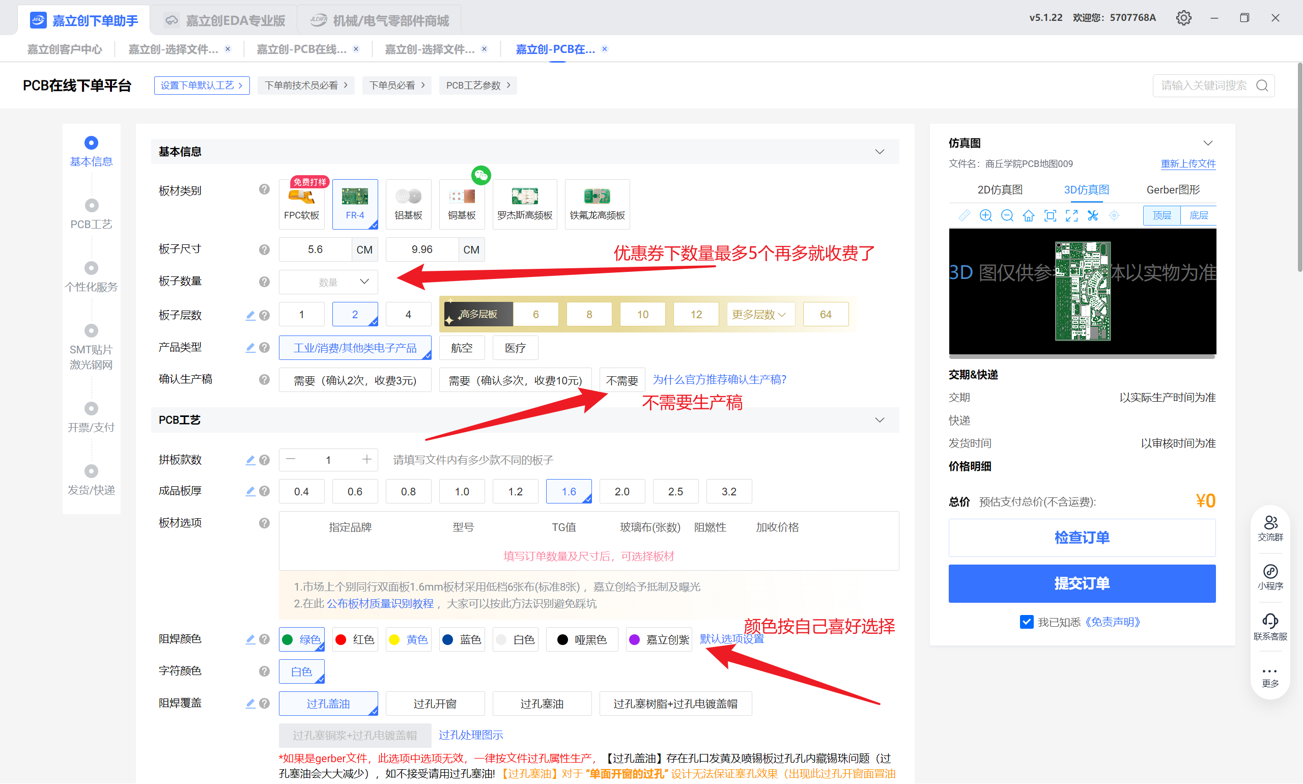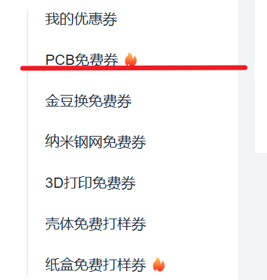 答:免费档支持2层板、≤10cm×10cm、白色或绿色阻焊,每月限3次。本教程采用沉金打板,但普通用户领取的优惠券无法打沉金。