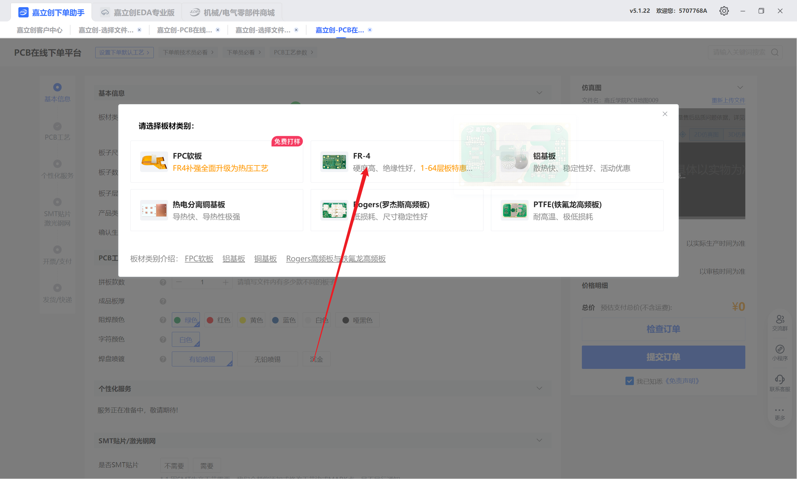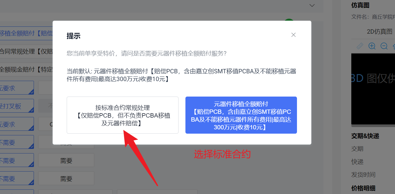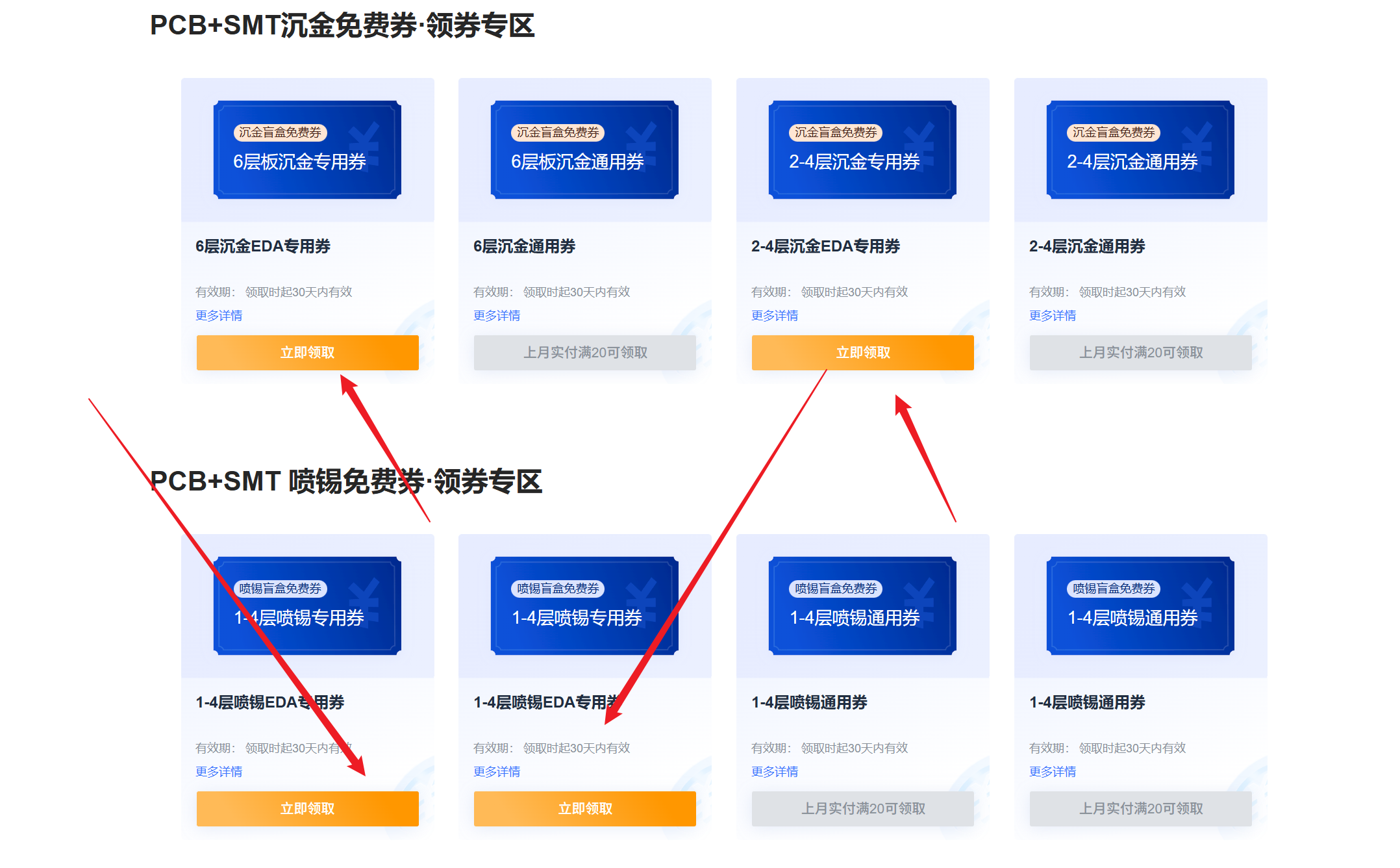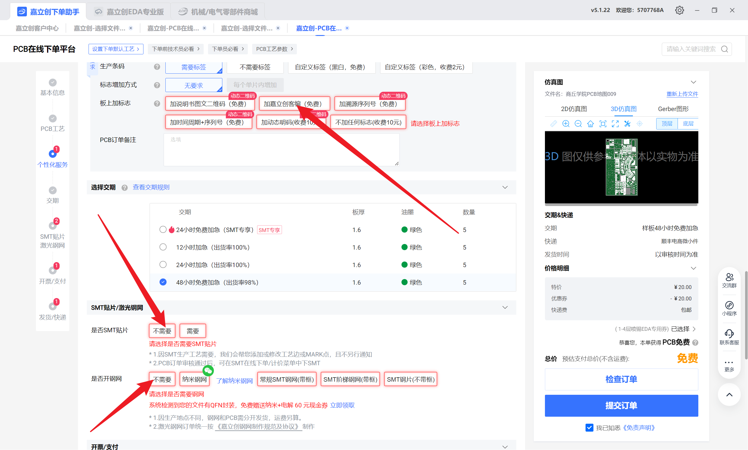 答:免费档支持2层板、≤10cm×10cm、白色或绿色阻焊,每月限3次。本教程采用沉金打板,但普通用户领取的优惠券无法打沉金。