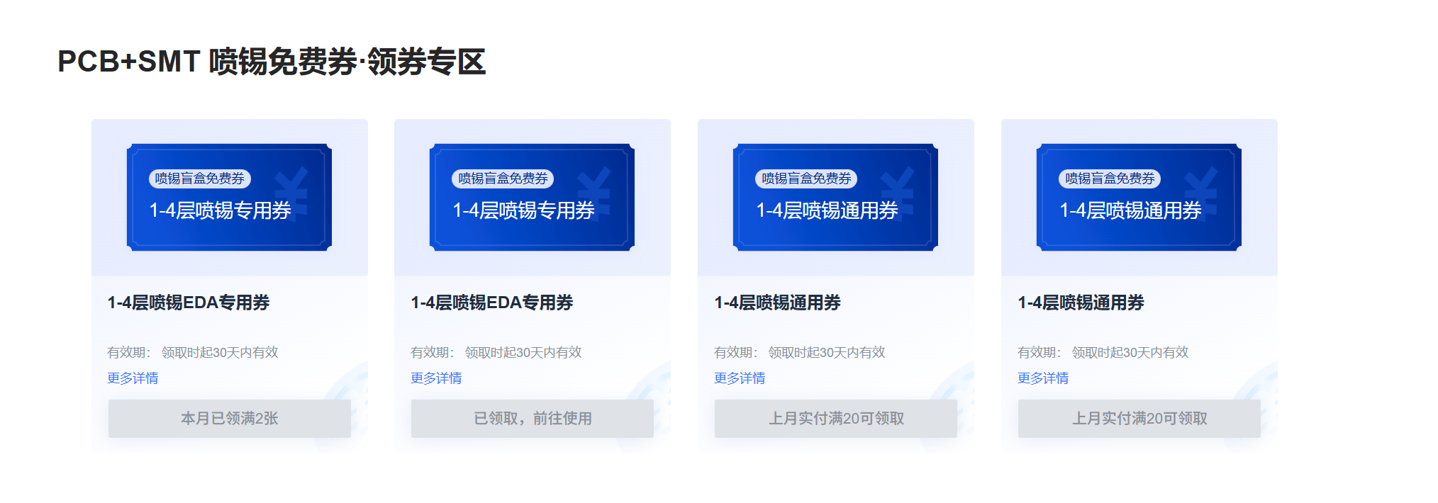 进入“优惠券中心”后,点击“PCB免费券”获取可用优惠券。注意查看优惠券有效期和适用范围,确保其可用于当前订单。部分优惠券需手动激活或满足条件后才可使用。