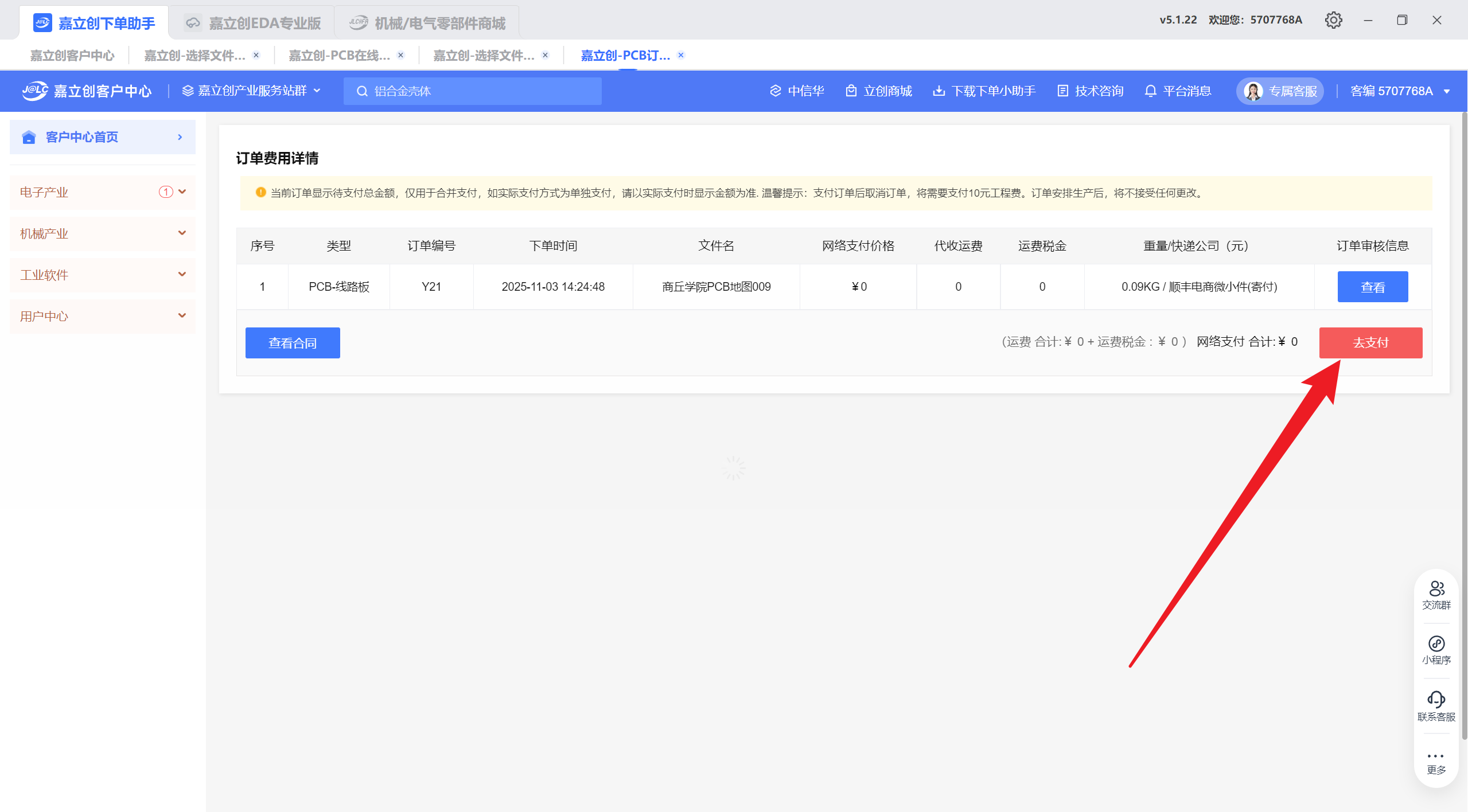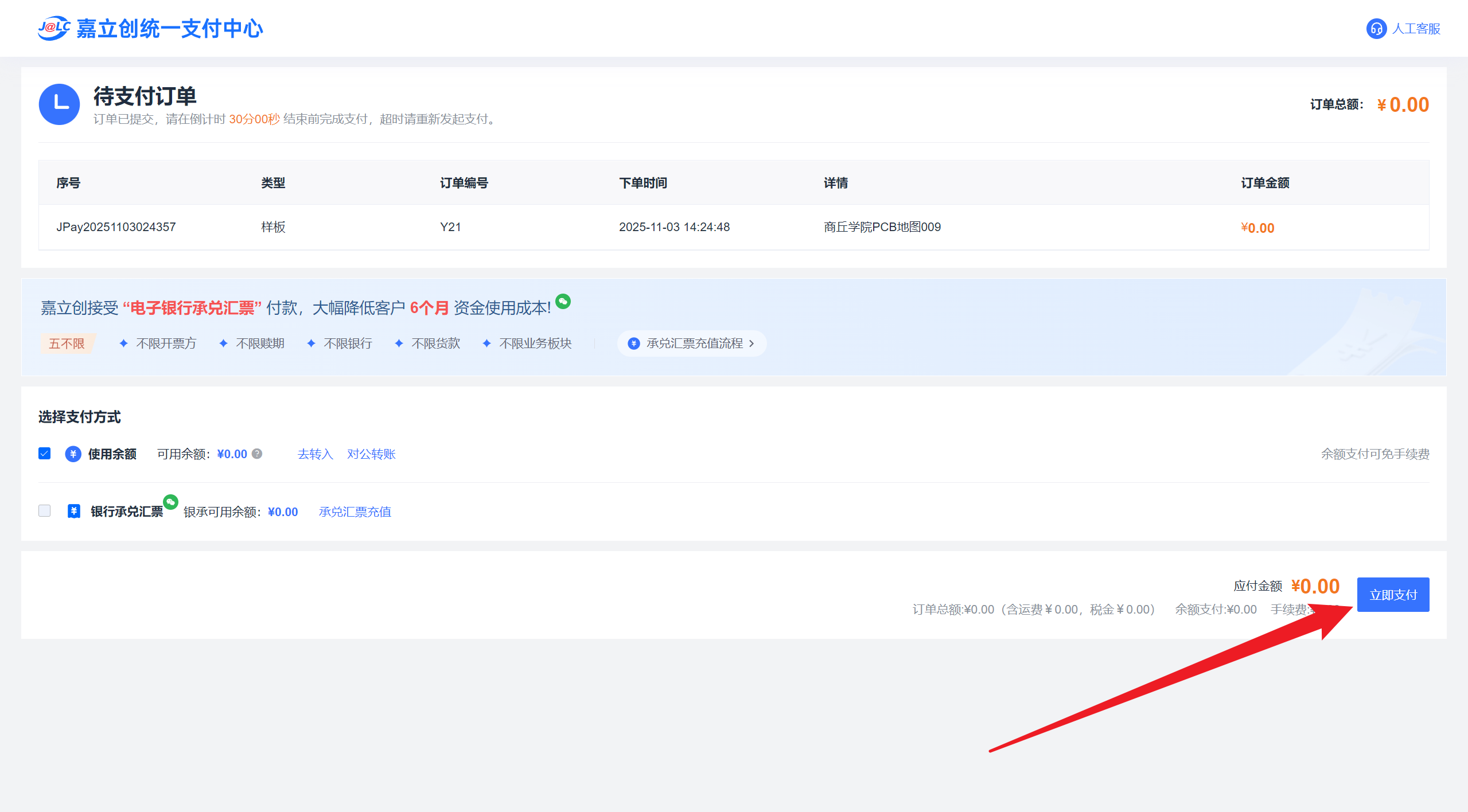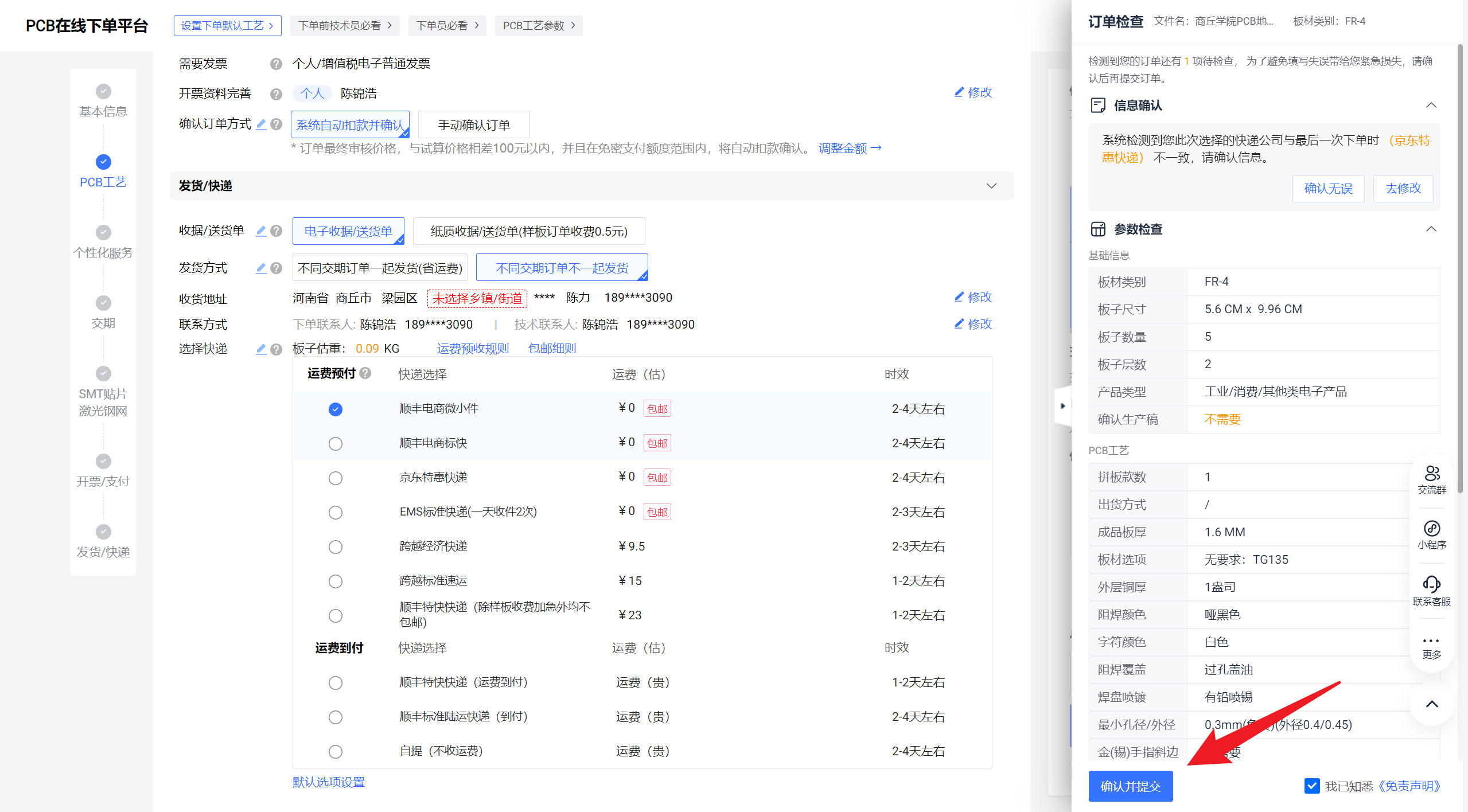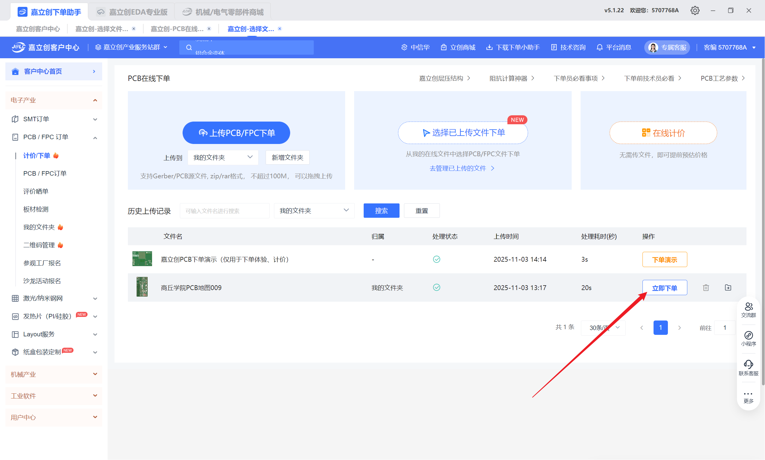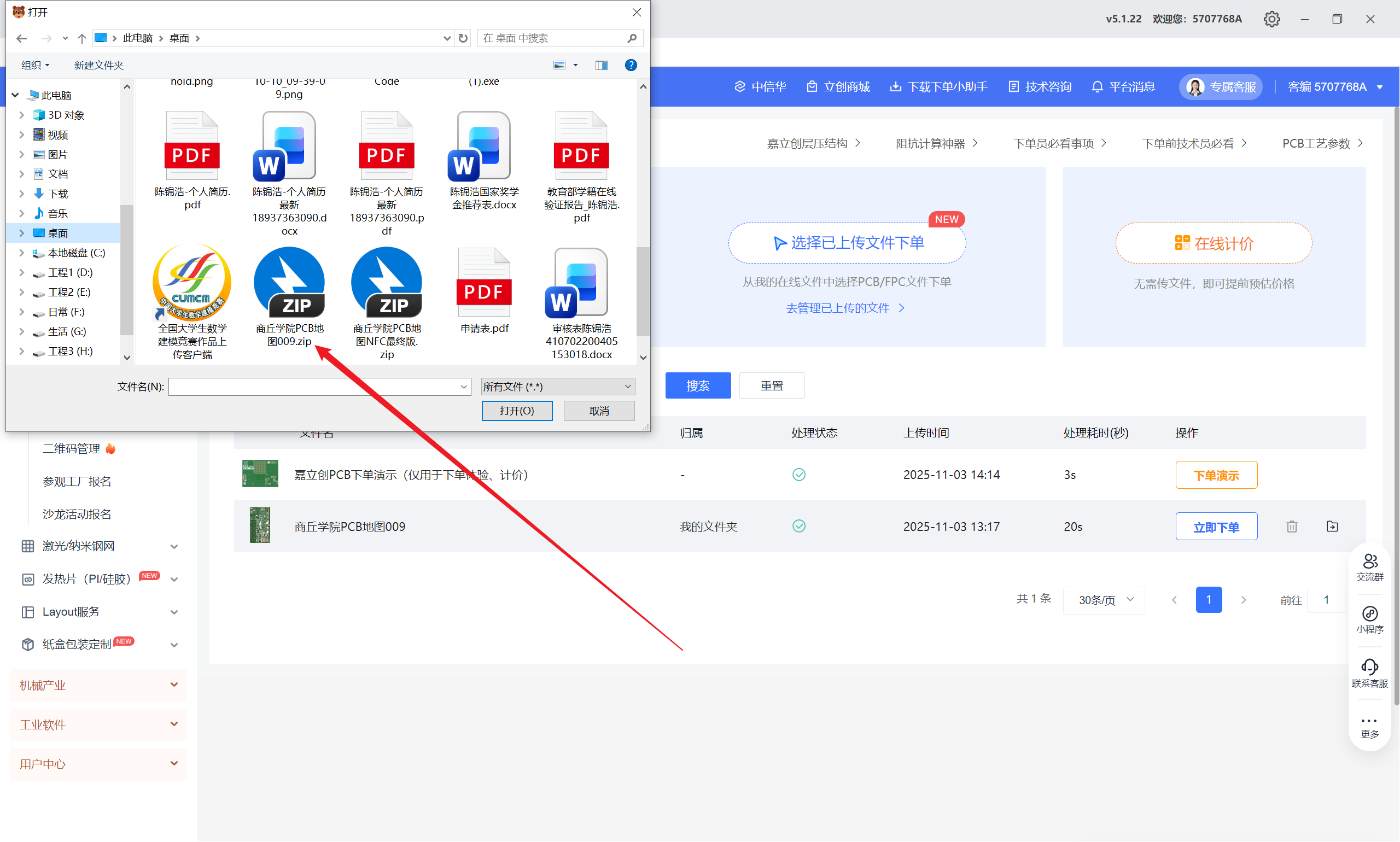 进入下单页面后选择下载的制板ZIP文件上传,上传完毕后点击立即下单,然后设置下单信息。